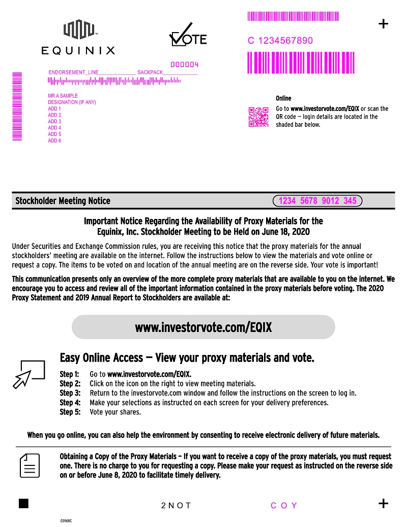 MMMMMMMMMMMM + MMMMMMM C 1234567890 000004 ENDORSEMENT_LINE______________ SACKPACK_____________ MR A SAMPLE DESIGNATION (IF ANY) ADD 1 ADD 2 ADD 3 ADD 4 ADD 5 ADD 6 Online Go to www.investorvote.com/EQIX or scan the QR code — login details are located in the shaded bar below. Important Notice Regarding the Availability of Proxy Materials for the Equinix, Inc. Stockholder Meeting to be Held on June 18, 2020 Under Securities and Exchange Commission rules, you are receiving this notice that the proxy materials for the annual stockholders’ meeting are available on the internet. Follow the instructions below to view the materials and vote online or request a copy. The items to be voted on and location of the annual meeting are on the reverse side. Your vote is important! This communication presents only an overview of the more complete proxy materials that are available to you on the internet. We encourage you to access and review all of the important information contained in the proxy materials before voting. The 2020 Proxy Statement and 2019 Annual Report to Stockholders are available at: www.investorvote.com/EQIX Easy Online Access — View your proxy materials and vote. Step 1: Step 2: Step 3: Step 4: Step 5: Go to www.investorvote.com/EQIX. Click on the icon on the right to view meeting materials. Return to the investorvote.com window and follow the instructions on the screen to log in. Make your selections as instructed on each screen for your delivery preferences. Vote your shares. When you go online, you can also help the environment by consenting to receive electronic delivery of future materials. Obtaining a Copy of the Proxy Materials – If you want to receive a copy of the proxy materials, you must request one. There is no charge to you for requesting a copy. Please make your request as instructed on the reverse side on or before June 8, 2020 to facilitate timely delivery. + 2 N O T C O Y 0396RC MMMMMMMMM Stockholder Meeting Notice 1234 5678 9012 345