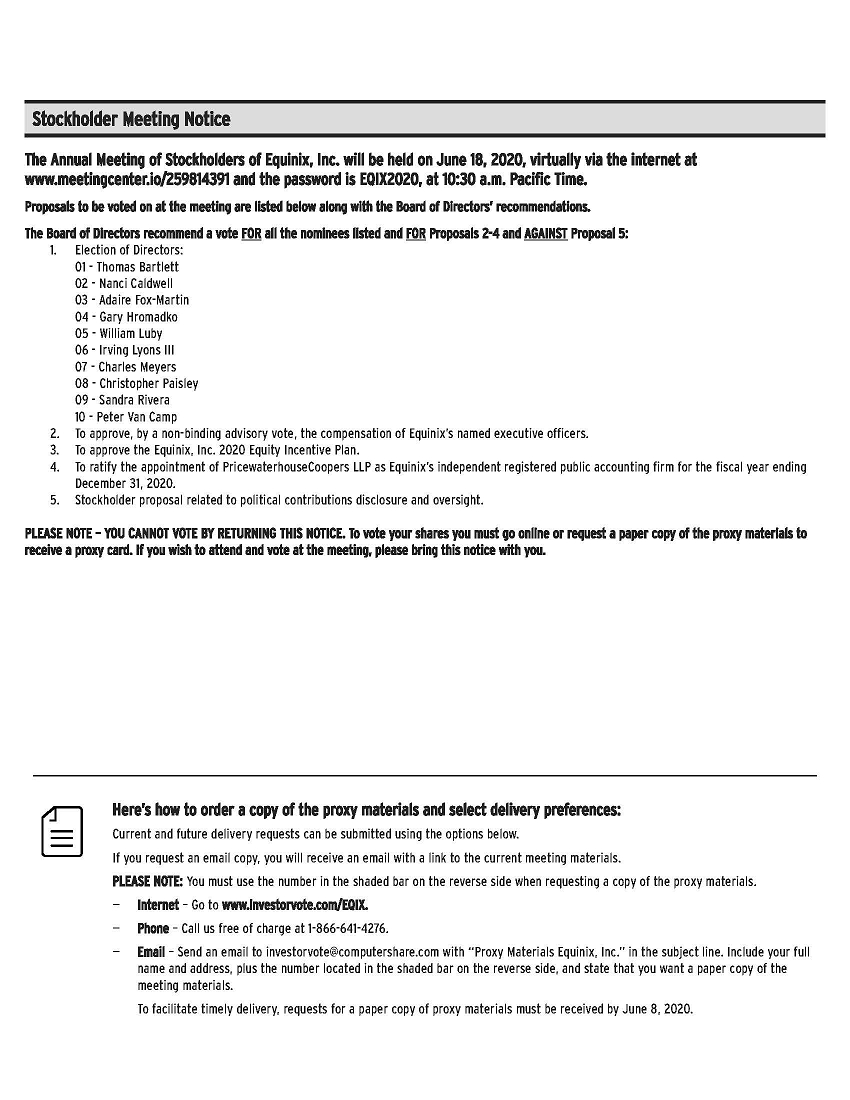 The Annual Meeting of Stockholders of Equinix, Inc. will be held on June 18, 2020, virtually via the internet at www.meetingcenter.io/259814391 and the password is EQIX2020, at 10:30 a.m. Pacific Time. Proposals to be voted on at the meeting are listed below along with the Board of Directors’ recommendations. The Board of Directors recommend a vote FOR all the nominees listed and FOR Proposals 2-4 and AGAINST Proposal 5: 1. Election of Directors: 01 - Thomas Bartlett 02 - Nanci Caldwell 03 - Adaire Fox-Martin 04 - Gary Hromadko 05 - William Luby 06 - Irving Lyons III 07 - Charles Meyers 08 - Christopher Paisley 09 - Sandra Rivera 10 - Peter Van Camp To approve, by a non-binding advisory vote, the compensation of Equinix’s named executive officers. To approve the Equinix, Inc. 2020 Equity Incentive Plan. To ratify the appointment of PricewaterhouseCoopers LLP as Equinix’s independent registered public accounting firm for the fiscal year ending December 31, 2020. Stockholder proposal related to political contributions disclosure and oversight. 2. 3. 4. 5. PLEASE NOTE – YOU CANNOT VOTE BY RETURNING THIS NOTICE. To vote your shares you must go online or request a paper copy of the proxy materials to receive a proxy card. If you wish to attend and vote at the meeting, please bring this notice with you. Here’s how to order a copy of the proxy materials and select delivery preferences: Current and future delivery requests can be submitted using the options below. If you request an email copy, you will receive an email with a link to the current meeting materials. PLEASE NOTE: You must use the number in the shaded bar on the reverse side when requesting a copy of the proxy materials. — — — Internet – Go to www.investorvote.com/EQIX. Phone – Call us free of charge at 1-866-641-4276. Email – Send an email to investorvote@computershare.com with “Proxy Materials Equinix, Inc.” in the subject line. Include your full name and address, plus the number located in the shaded bar on the reverse side, and state that you want a paper copy of the meeting materials. To facilitate timely delivery, requests for a paper copy of proxy materials must be received by June 8, 2020. Stockholder Meeting Notice