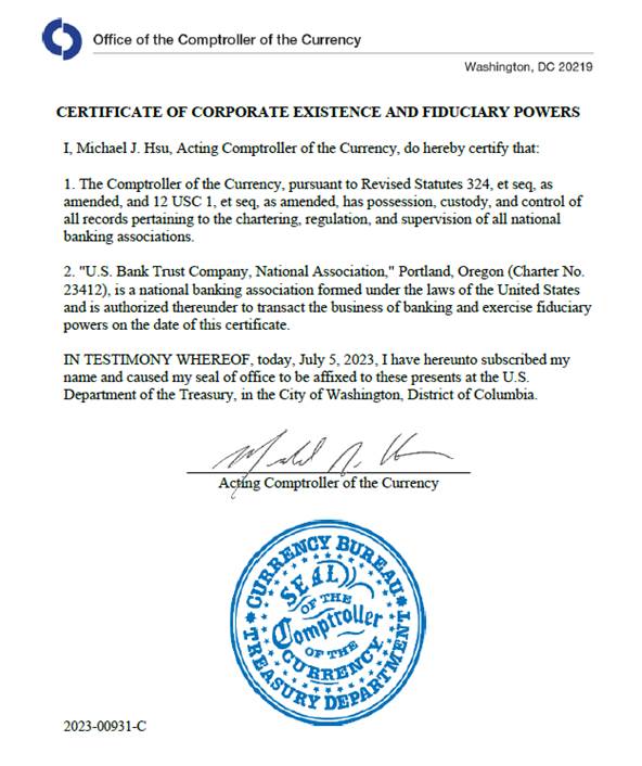 In accordance with Section 321(b) of the Trust Indenture Act of 1939, the undersigned, U.S. BANK TRUST COMPANY, NATIONAL ASSOCIATION hereby consents that reports of examination of the undersigned by Federal, State, Territorial or District authorities may be furnished by such authorities to the Securities and Exchange Commission upon its request therefor.