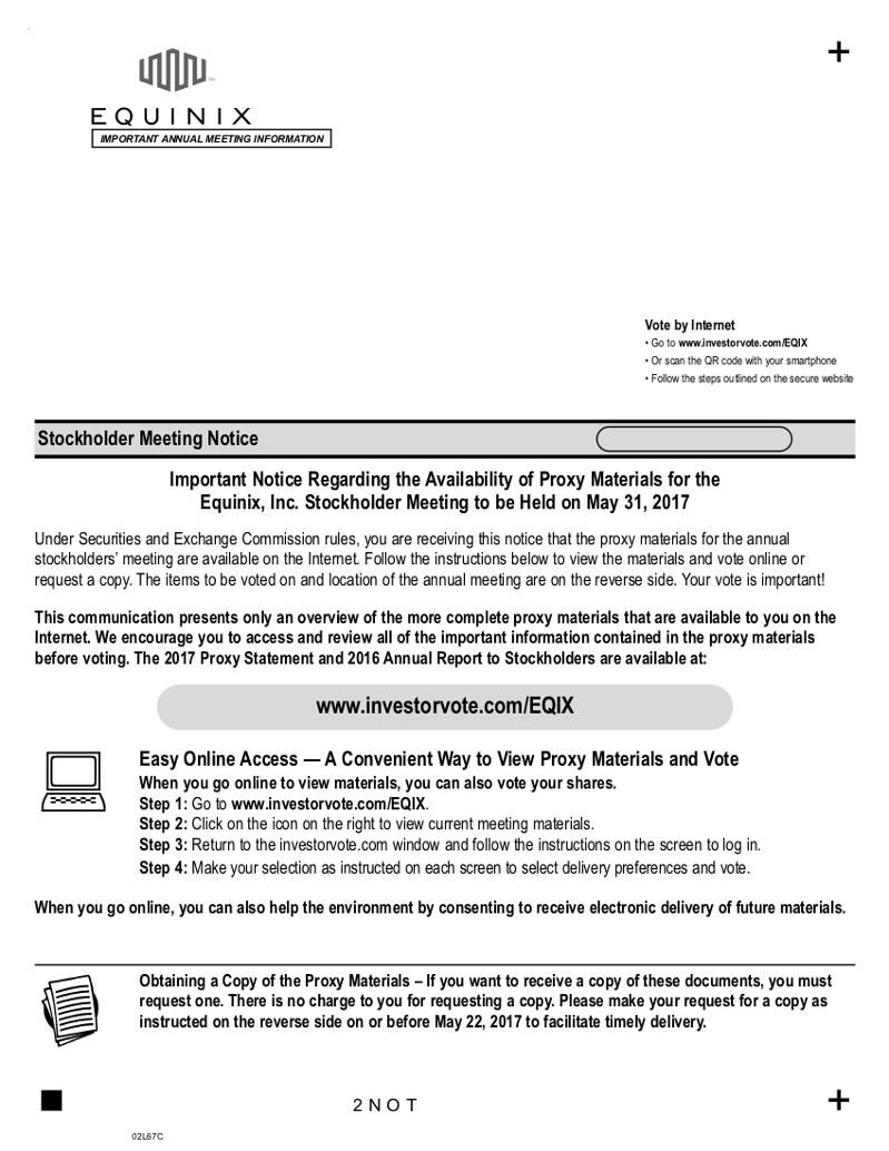 .. Important Notice Regarding the Availability of Proxy Materials for the Equinix, Inc. Stockholder Meeting to be Held on May 31, 2017 Under Securities and Exchange Commission rules, you are receiving this notice that the proxy materials for the annual stockholders’ meeting are available on the Internet. Follow the instructions below to view the materials and vote online or request a copy. The items to be voted on and location of the annual meeting are on the reverse side. Your vote is important! This communication presents only an overview of the more complete proxy materials that are available to you on the Internet. We encourage you to access and review all of the important information contained in the proxy materials before voting. The 2017 Proxy Statement and 2016 Annual Report to Stockholders are available at: When you go online to view materials, you can also vote your shares. Step 1: Go to www.investorvote.com/EQIX. Step 2: Click on the icon on the right to view current meeting materials. Step 3: Return to the investorvote.com window and follow the instructions on the screen to log in. Step 4: Make your selection as instructed on each screen to select delivery preferences and vote. When you go online, you can also help the environment by consenting to receive electronic delivery of future materials. Obtaining a Copy of the Proxy Materials – If you want to receive a copy of these documents, you must request one. There is no charge to you for requesting a copy. Please make your request for a copy as instructed on the reverse side on or before May 22, 2017 to facilitate timely delivery. 2NOT + 02L67C