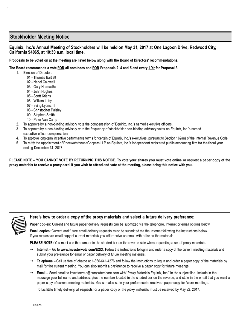 .. Stockholder Meeting Notice Equinix, Inc.’s Annual Meeting of Stockholders will be held on May 31, 2017 at One Lagoon Drive, Redwood City,California 94065, at 10:30 a.m. local time. Proposals to be voted on at the meeting are listed below along with the Board of Directors’ recommendations. The Board recommends a vote FOR all nominees and FOR Proposals 2, 4 and 5 and every 1 Yr for Proposal 3. 1. Election of Directors: 01 -Thomas Bartlett 02 - Nanci Caldwell 03 -Gary Hromadko 04 -John Hughes 05 - Scott Kriens 06 - William Luby 07 - Irving Lyons, III 08 -Christopher Paisley 09 - Stephen Smith 10 - Peter Van Camp 2. To approve by a non-binding advisory vote the compensation of Equinix, Inc.’s named executive officers. 3. To approve by a non-binding advisory vote the frequency of stockholder non-binding advisory votes on Equinix, Inc.’s named executive officer compensation. 4. To approve long-term incentive performance terms for certain of Equinix, Inc.’s executives, pursuant to Section 162(m) of the Internal Revenue Code. 5. To ratify the appointment of PricewaterhouseCoopers LLP as Equinix, Inc.’s independent registered public accounting firm for the fiscal year ending December 31, 2017. PLEASE NOTE – YOU CANNOT VOTE BY RETURNING THIS NOTICE. To vote your shares you must vote online or request a paper copy of the proxy materials to receive a proxy card. If you wish to attend and vote at the meeting, please bring this notice with you. Here’s how to order a copy of the proxy materials and select a future delivery preference: Paper copies: Current and future paper delivery requests can be submitted via the telephone, Internet or email options below. Email copies: Current and future email delivery requests must be submitted via the Internet following the instructions below. If you request an email copy of current materials you will receive an email with a link to the materials. PLEASE NOTE: You must use the number in the shaded bar on the reverse side when requesting a set of proxy materials. • Internet – Go to www.investorvote.com/EQIX. Follow the instructions to log in and order a copy of the current meeting materials and submit your preference for email or paper delivery of future meeting materials. • Telephone – Call us free of charge at 1-866-641-4276 and follow the instructions to log in and order a paper copy of the materials by mail for the current meeting. You can also submit a preference to receive a paper copy for future meetings. • Email – Send email to investorvote@computershare.com with “Proxy Materials Equinix, Inc.” in the subject line. Include in the message your full name and address, plus the number located in the shaded bar on the reverse, and state in the email that you want a paper copy of current meeting materials. You can also state your preference to receive a paper copy for future meetings. To facilitate timely delivery, all requests for a paper copy of the proxy materials must be received by May 22, 2017. 02L67C
