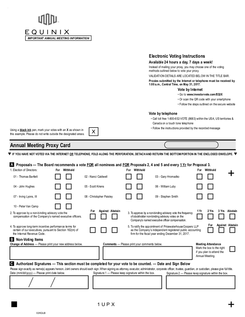 .. IMPORTANT ANNUAL MEETING INFORMATION Electronic Voting Instructions Available 24 hours a day, 7 days a week! Instead of mailing your proxy, you may choose one of the voting methods outlined below to vote your proxy. VALIDATION DETAILS ARE LOCATED BELOW IN THE TITLE BAR. Proxies submitted by the Internet or telephone must be received by 1:00 a.m., Central Time, on May 31, 2017. Vote by Internet • Go to www.investorvote.com/EQIX • Or scan the QR code with your smartphone • Follow the steps outlined on the secure website Vote by telephone • Call toll free 1-800-652-VOTE (8683) within the USA, US territories & Canada on a touch tone telephone • Follow the instructions provided by the recorded message Using a black ink pen, mark your votes with an X as shown in this example. Please do not write outside the designated areas. X Annual Meeting Proxy Card • IF YOU HAVE NOT VOTED VIA THE INTERNET OR TELEPHONE, FOLD ALONG THE PERFORATION, DETACH AND RETURN THE BOTTOM PORTION IN THE ENCLOSED ENVELOPE. • Proposals — The Board recommends a vote FOR all nominees and FOR Proposals 2, 4 and 5 and every 1 Yr for Proposal 3. 1. Election of Directors: For Withhold 01 - Thomas Bartlett 04 - John Hughes 07 - Irving Lyons, III 10 - Peter Van Camp 2. To approve by a non-binding advisory vote the compensation of the Company’s named executive officers. 4. To approve long-term incentive performance terms for certain of our executives, pursuant to Section 162(m) of the Internal Revenue Code. Non-Voting Items Change of Address — Please print your new address below. 02 - Nanci Caldwell 05 - Scott Kriens 08 - Christopher Paisley For Against Abstain For Withhold For Withhold 03 - Gary Hromadko 06 - William Luby 09 - Stephen Smith 1 Yr 3. To approve by a non-binding advisory vote the frequency of stockholder non-binding advisory votes on the Company’s named executive officer compensation. 5. To ratify the appointment of PricewaterhouseCoopers LLP as the Company’s independent registered public accounting firm for the fiscal year ending December 31, 2017. + 2 Yrs 3 Yrs Abstain For Against Abstain Comments — Please print your comments below. Meeting Attendance Mark the box to the right if you plan to attend the Annual Meeting. Authorized Signatures — This section must be completed for your vote to be counted. — Date and Sign Below Please sign exactly as name(s) appears hereon. Joint owners should each sign. When signing as attorney, executor, administrator, corporate officer, trustee, guardian, or custodian, please give full title. Date (mm/dd/yyyy) — Please print date below. Signature 1 — Please keep signature within the box. Signature 2 — Please keep signature within the box. 1UPX + 02KQLB