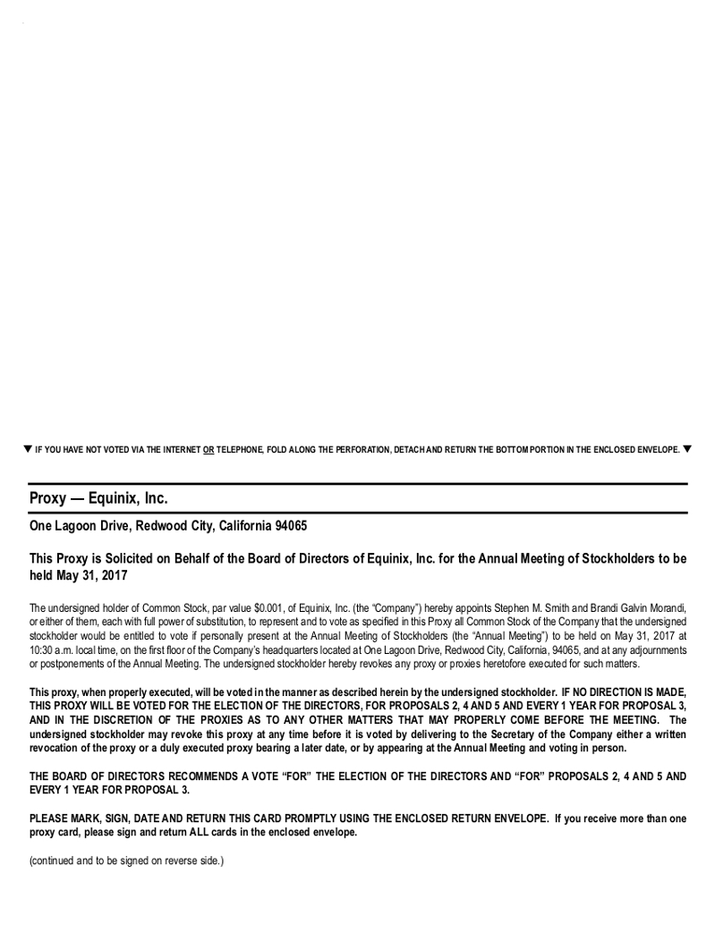 .. • IF YOU HAVE NOT VOTED VIA THE INTERNET OR TELEPHONE, FOLD ALONG THE PERFORATION, DETACH AND RETURN THE BOTTOM PORTION IN THE ENCLOSED ENVELOPE. • Proxy — Equinix, Inc. One Lagoon Drive, Redwood City, California 94065 This Proxy is Solicited on Behalf of the Board of Directors of Equinix, Inc. for the Annual Meeting of Stockholders to be held May 31, 2017 The undersigned holder of Common Stock, par value $0.001, of Equinix, Inc. (the “Company”) hereby appoints Stephen M. Smith and Brandi Galvin Morandi, or either of them, each with full power of substitution, to represent and to vote as specified in this Proxy all Common Stock of the Company that the undersigned stockholder would be entitled to vote if personally present at the Annual Meeting of Stockholders (the “Annual Meeting”) to be held on May 31, 2017 at 10:30 a.m. local time, on the first floor of the Company’s headquarters located at One Lagoon Drive, Redwood City, California, 94065, and at any adjournments or postponements of the Annual Meeting. The undersigned stockholder hereby revokes any proxy or proxies heretofore executed for such matters. This proxy, when properly executed, will be voted in the manner as described herein by the undersigned stockholder. IF NO DIRECTION IS MADE, THIS PROXY WILL BE VOTED FOR THE ELECTION OF THE DIRECTORS, FOR PROPOSALS 2, 4 AND 5 AND EVERY 1 YEAR FOR PROPOSAL 3, AND IN THE DISCRETION OF THE PROXIES AS TO ANY OTHER MATTERS THAT MAY PROPERLY COME BEFORE THE MEETING. The undersigned stockholder may revoke this proxy at any time before it is voted by delivering to the Secretary of the Company either a written revocation of the proxy or a duly executed proxy bearing a later date, or by appearing at the Annual Meeting and voting in person. THE BOARD OF DIRECTORS RECOMMENDS A VOTE “FOR” THE ELECTION OF THE DIRECTORS AND “FOR” PROPOSALS 2, 4 AND 5 AND EVERY 1 YEAR FOR PROPOSAL 3. PLEASE MARK, SIGN, DATE AND RETURN THIS CARD PROMPTLY USING THE ENCLOSED RETURN ENVELOPE. If you receive more than one proxy card, please sign and return ALL cards in the enclosed envelope. (continued and to be signed on reverse side.)
